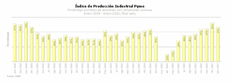 En enero, el 47% de las industrias pymes consultadas tuvieron rentabilidad positiva, retrocediendo 5 puntos esa proporción frente a diciembre (52%). Son muchas las empresas que quedaron debilitadas después del difícil 2020 y están tratando de recuperarse, aún en un contexto económico que lentamente va mejorando. El 32% de las firmas tuvo rentabilidad nula y 17%, negativa.